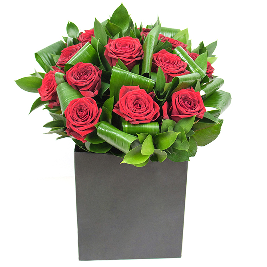 Experience the timeless beauty of our exquisite bouquet featuring vibrant red roses, lush aspidistra leaves, and delicate ruscus. This unique arrangement adds a touch of sophistication and charm to any space.